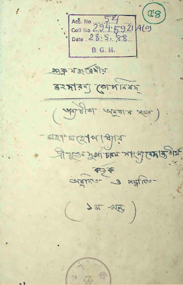 শুক্লযজুর্ব্বেদীয় বৃহদারণ্যকোপনিষদ্ (প্রথম খণ্ড) Shukla Yajurvediya Brihadaranyakopanishad (1st Vol.)